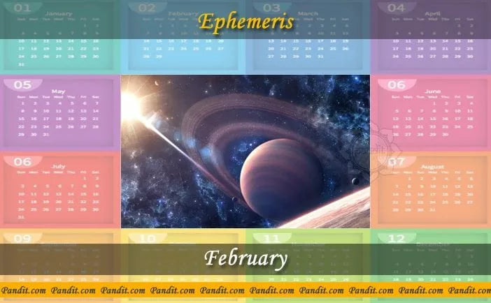 9 ग्रहों की सटीक डिग्री के साथ फरवरी 2016 के लिए नि:शुल्क ज्योतिष पंचांग। अर्थात सूर्य, चंद्रमा, मंगल, बुध, बृहस्पति, शुक्र, शनि, राहु, केतु। यह शुद्ध है वैदिक पंचांग तालिका और यह वैज्ञानिक स्विस खगोलीय गणना पर आधारित है।