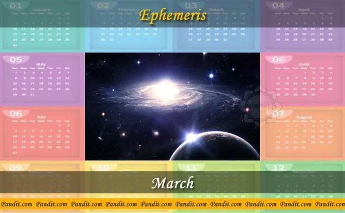 मार्च 2016 के लिए निशुल्क ज्योतिष पंचांग "9 ग्रहों की सटीक डिग्री के साथ। अर्थात सूर्य, चंद्रमा, मंगल, बुध, बृहस्पति, शुक्र, शनि, राहु, केतु। यह शुद्ध है वैदिक पंचांग तालिका और यह वैज्ञानिक स्विस खगोलीय गणना पर आधारित है।